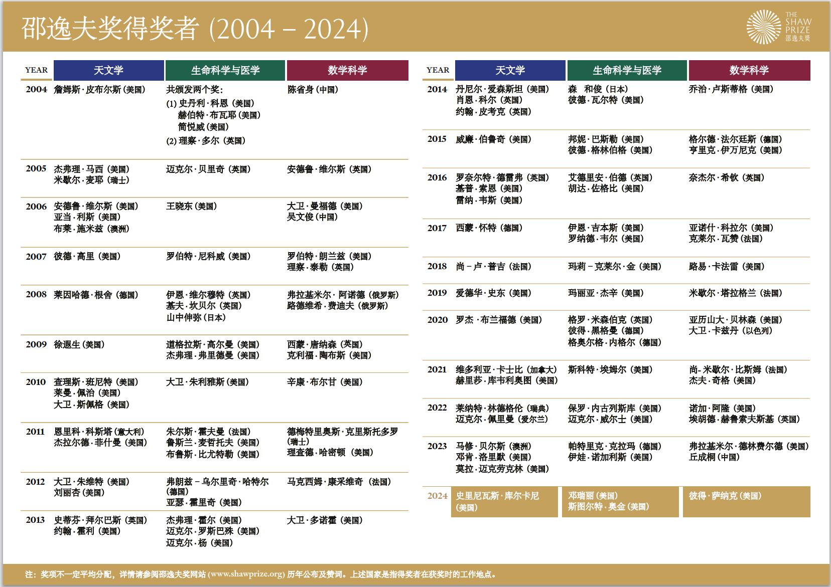 新華社香港5月21日電(記者謝妞)邵逸夫獎基金會21日在香港公布2024年度邵逸夫獎獲獎名單,4位科學(xué)家分獲天文學(xué)、生命科學(xué)與醫(yī)學(xué)、數(shù)學(xué)科學(xué)3個獎項,每項獎金120萬美元。