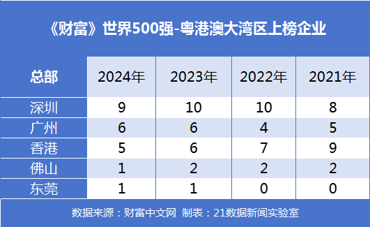 從地域上看,此次上榜的大灣區(qū)公司中,總部集中在“五座萬(wàn)億城”,深圳有9家公司上榜,數(shù)量位居大灣區(qū)第一;其次為廣州,有6家上榜,香港有5家公司上榜,佛山、東莞分別有1家公司位列世界500強(qiáng)。