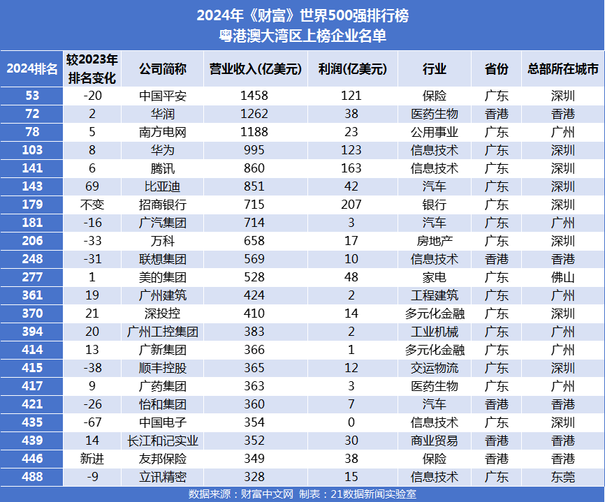 據(jù)21數(shù)據(jù)新聞實(shí)驗(yàn)室統(tǒng)計(jì),粵港澳大灣區(qū)共有22家公司入圍世界500強(qiáng),2023年?duì)I收總額約為1.39萬(wàn)億美元,利潤(rùn)總額為919億美元。
