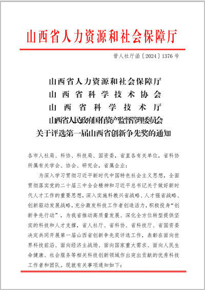 近日,省人社廳、省科協(xié)、省科技廳、省國資委聯合下發(fā)通知,決定共同開展第一屆山西省創(chuàng)新爭先獎評選工作,以表彰在面向世界科技前沿、面向經濟主戰(zhàn)場等相關科技創(chuàng)新領域作出突出貢獻的優(yōu)秀科技工作者和團隊。