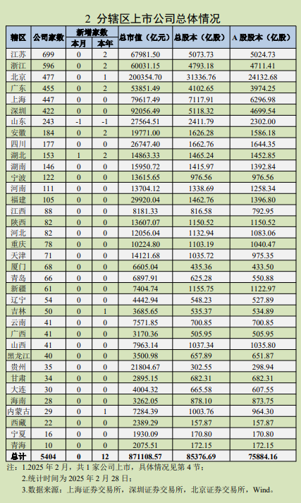 中國上市公司協(xié)會(huì)3月25日發(fā)布的2025年2月統(tǒng)計(jì)月報(bào)顯示,截至2月28日,境內(nèi)股票市場共有上市公司5404家,滬、深、北證券交易所分別為2282、2858、264家。