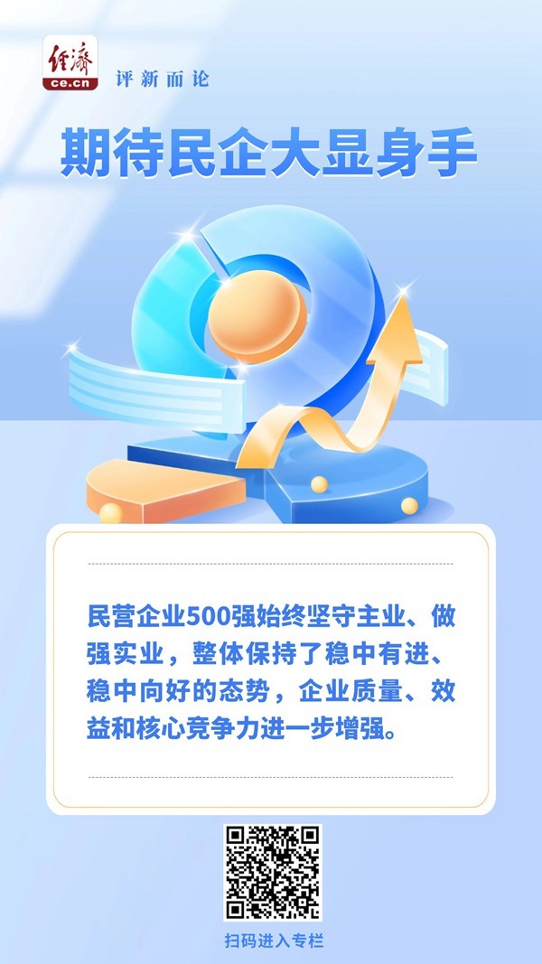 奮楫者先,創(chuàng)新者強。面對外部壓力加大、內(nèi)部困難增多的復雜嚴峻形勢,民營企業(yè)500強始終堅守主業(yè)、做強實業(yè),整體保持了穩(wěn)中有進、穩(wěn)中向好的態(tài)勢,企業(yè)質(zhì)量、效益和核心競爭力進一步增強。這不僅是民營經(jīng)濟韌性的生動體現(xiàn),更折射出中國經(jīng)濟的蓬勃活力與深厚潛力。同時也需理性清醒地認識到,我國民營企業(yè)仍有很大的發(fā)展空間,未來需進一步保持戰(zhàn)略定力、堅定發(fā)展信心,心無旁騖辦好自己的事,在深耕領域中持續(xù)突破。期待以“500強”為代表的民營企業(yè)在廣闊前景中大顯身手,為中國經(jīng)濟高質(zhì)量發(fā)展注入更澎湃的動能。(中國經(jīng)濟網(wǎng)專欄作者 喬瑞慶)