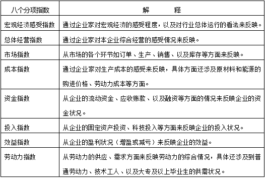 在行業(yè)選取的過程中,依據(jù)國民經(jīng)濟各行業(yè)對GDP的貢獻度,共選取了工業(yè)、建筑業(yè)、交通運輸郵政倉儲業(yè)、房地產(chǎn)業(yè)、批發(fā)零售業(yè)、社會服務業(yè)、信息傳輸計算機服務和軟件業(yè)、住宿餐飲業(yè)等八大行業(yè)。每個行業(yè)的調(diào)查內(nèi)容,具體包括八個大的分項:宏觀經(jīng)濟感受、總體經(jīng)營、市場、成本、資金、投入、效益、勞動力。在具體調(diào)查過程中,考慮到不同行業(yè)的特點,八個大的分項里面的細項調(diào)查有所區(qū)別。