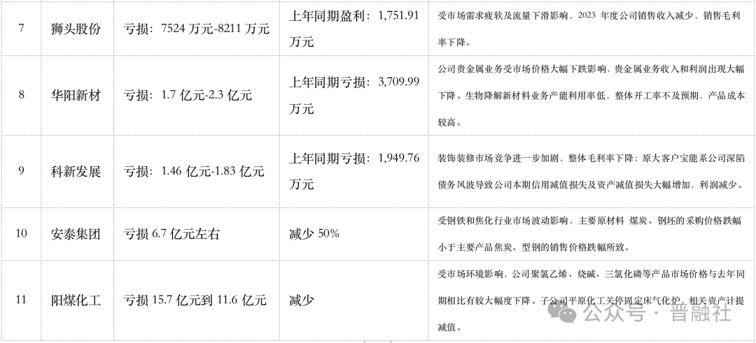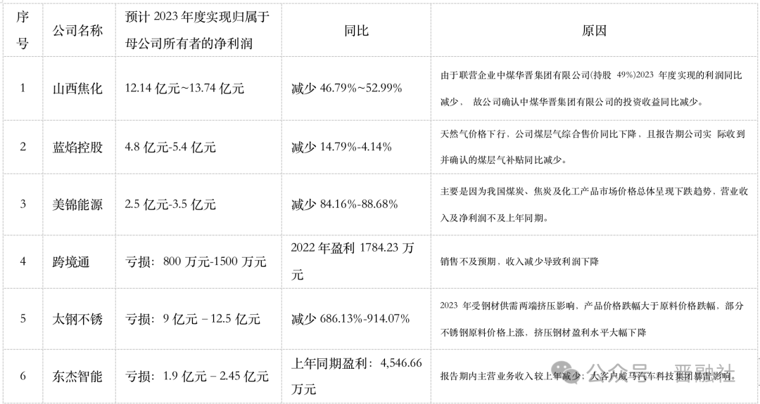 太鋼不銹預(yù)計(jì)2023年虧損9億元–12.5億元,同比減少686.13%-914.07%;美錦能源預(yù)計(jì)2023年凈利潤(rùn)為2.5億元-3.5億元,同比減少84.16%-88.68%;華陽(yáng)新材預(yù)計(jì)2023年虧損1.7億元-2.3億元,2022年虧損0.37億元……這些企業(yè)業(yè)績(jī)下滑原因多系市場(chǎng)行情影響所致。