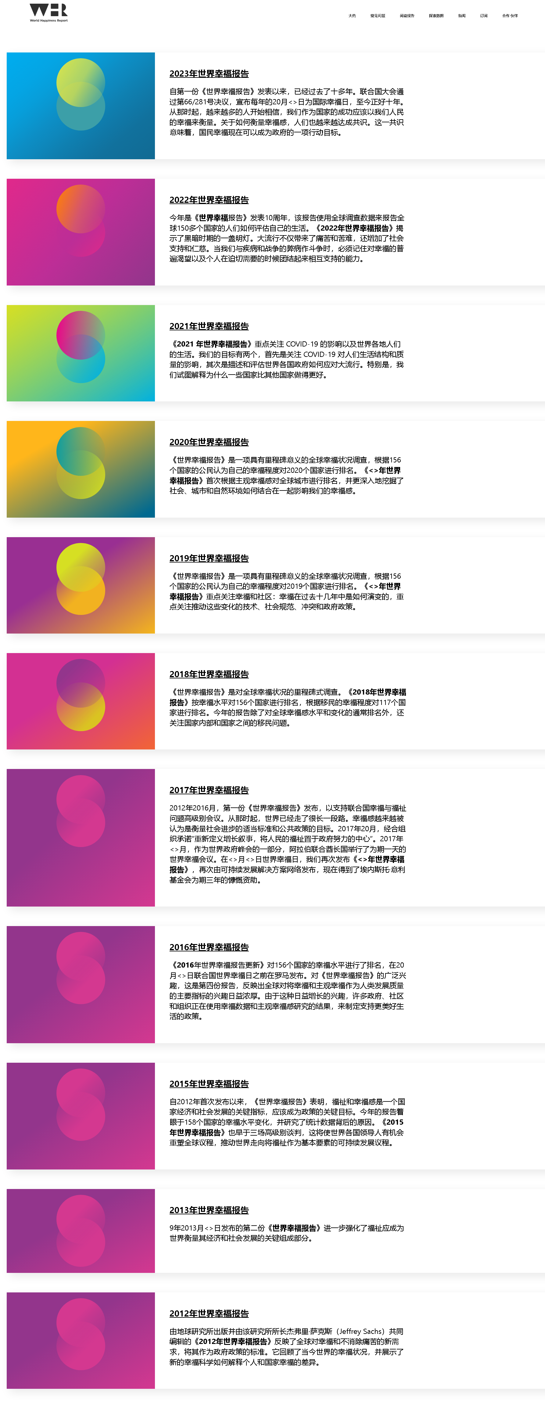 《世界幸福報(bào)告》是一項(xiàng)具有里程碑意義的全球幸福狀況調(diào)查,根據(jù)156個(gè)國(guó)家的公民認(rèn)為自己的幸福程度對(duì)2019個(gè)國(guó)家進(jìn)行排名。《<>年世界幸福報(bào)告》重點(diǎn)關(guān)注幸福和社區(qū):幸福在過(guò)去十幾年中是如何演變的,重點(diǎn)關(guān)注推動(dòng)這些變化的技術(shù)、社會(huì)規(guī)范、沖突和政府政策。