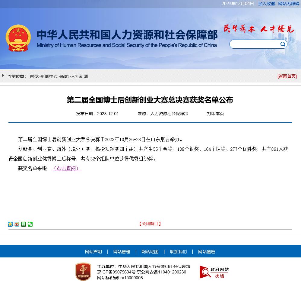 創(chuàng)新賽、創(chuàng)業(yè)賽、海外(境外)賽、揭榜領(lǐng)題賽四個組別共產(chǎn)生55個金獎、109個銀獎、164個銅獎、277個優(yōu)勝獎,共有861人獲得全國創(chuàng)新創(chuàng)業(yè)優(yōu)秀博士后稱號,共有32個組隊單位獲得優(yōu)秀組織獎。