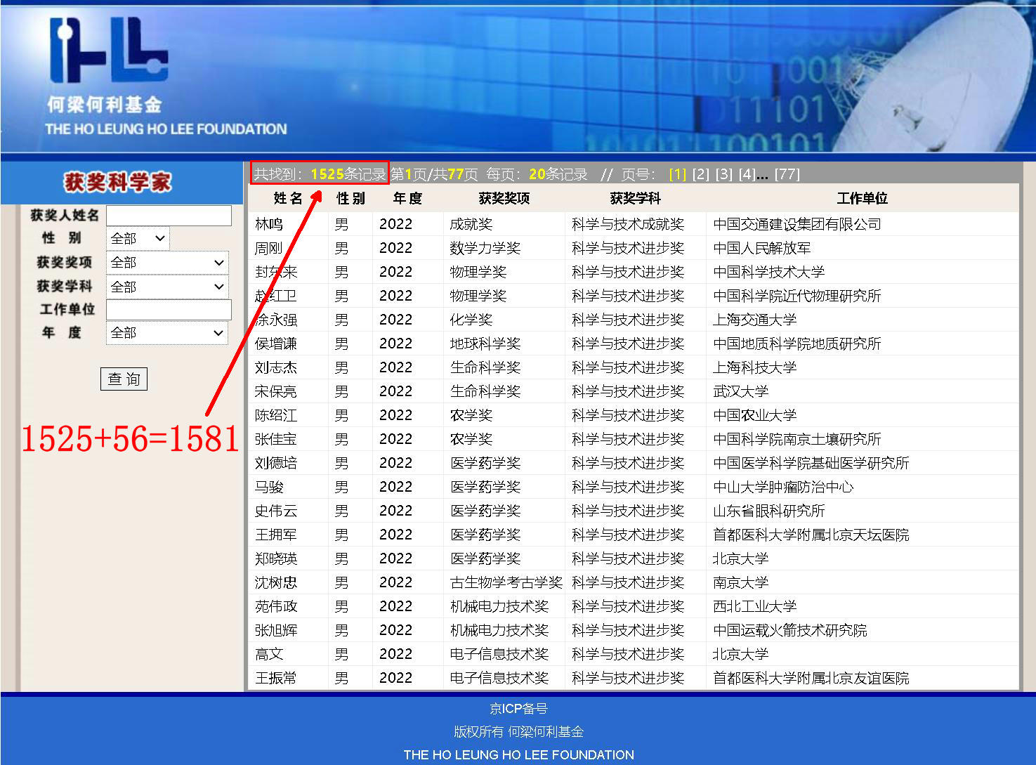 22. 谷超豪 中科院紫金山天文臺盱眙觀測站 男 成就獎(jiǎng) 科學(xué)與技術(shù)成就獎(jiǎng) 2005 46 622.