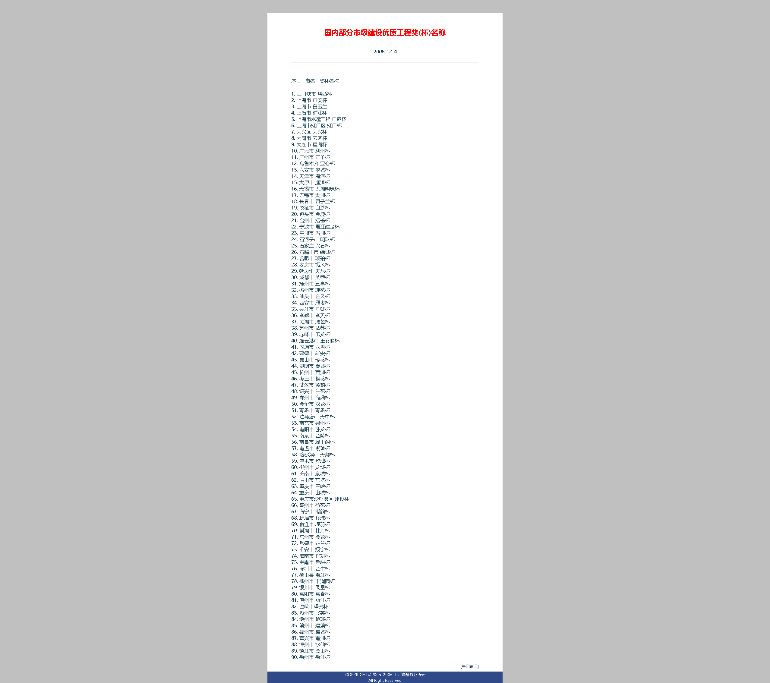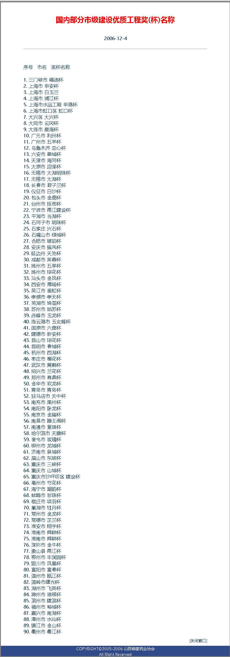 這是十七年前,在山西省建筑業(yè)協(xié)會(huì)管理網(wǎng)站時(shí),收集的全國(guó)各地建筑業(yè)評(píng)獎(jiǎng)名稱,對(duì)于了解我們這個(gè)行業(yè)和社會(huì)的重視程度,管中窺豹,可見(jiàn)一斑。做企業(yè),首先要知道和懂得瞄準(zhǔn)戰(zhàn)略目標(biāo),有的放矢,正中靶心。