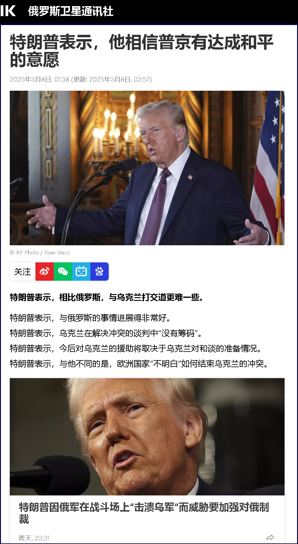 特朗普說,鑒于俄羅斯目前在戰(zhàn)場(chǎng)上“猛烈打擊”烏克蘭,他強(qiáng)烈考慮對(duì)俄實(shí)施包括針對(duì)銀行業(yè)在內(nèi)的大規(guī)模制裁以及加征關(guān)稅,以向其施壓達(dá)成?;鸷妥罱K和平協(xié)議。特朗普還敦促俄羅斯和烏克蘭“坐到談判桌上”。