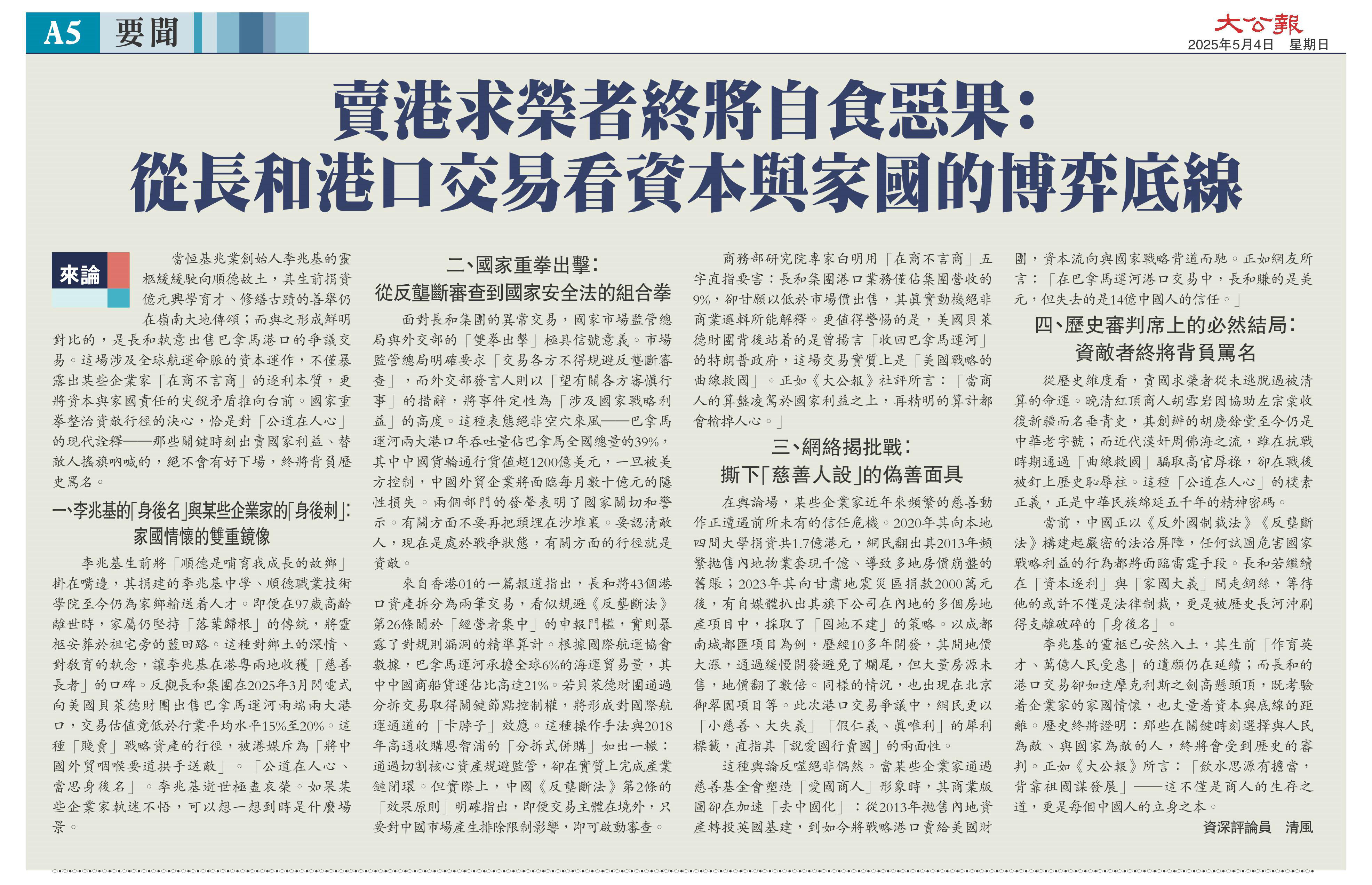 李兆基的靈柩已安然入土,其生前「作育英才、萬億人民受惠」的遺愿仍在延續(xù);而長(zhǎng)和的港口交易卻如達(dá)摩克利斯之劍高懸頭頂,既考驗(yàn)著企業(yè)家的家國(guó)情懷,也丈量著資本與底線的距離。歷史終將證明:那些在關(guān)鍵時(shí)刻選擇與人民為敵、與國(guó)家為敵的人,終將會(huì)受到歷史的審判。正如《大公報(bào)》所言:「飲水思源有擔(dān)當(dāng),背靠祖國(guó)謀發(fā)展」─這不僅是商人的生存之道,更是每個(gè)中國(guó)人的立身之本。 \資深評(píng)論員清風(fēng)