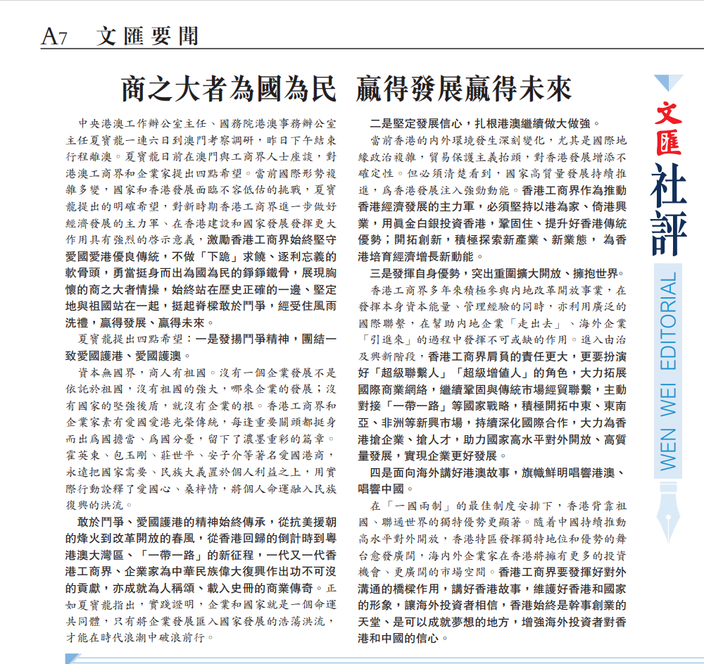 中央港澳工作辦公室主任、國(guó)務(wù)院港澳事務(wù)辦公室主任夏寶龍一連六日到澳門(mén)考察調(diào)研,昨日下午結(jié)束行程離澳。夏寶龍日前在澳門(mén)與工商界人士座談,對(duì)港澳工商界和企業(yè)家提出四點(diǎn)希望。當(dāng)前國(guó)際形勢(shì)復(fù)雜多變,國(guó)家和香港發(fā)展面臨不容低估的挑戰(zhàn),夏寶龍?zhí)岢龅拿鞔_希望,對(duì)新時(shí)期香港工商界進(jìn)一步做好經(jīng)濟(jì)發(fā)展的主力軍、在香港建設(shè)和國(guó)家發(fā)展發(fā)揮更大作用具有強(qiáng)烈的啟示意義,激勵(lì)香港工商界始終堅(jiān)守愛(ài)國(guó)愛(ài)港優(yōu)良傳統(tǒng),不做「下跪」求饒、逐利忘義的軟骨頭,勇當(dāng)挺身而出為國(guó)為民的錚錚鐵骨,展現(xiàn)胸懷的商之大者情操,始終站在歷史正確的一邊、堅(jiān)定地與祖國(guó)站在一起,挺起脊梁敢于斗爭(zhēng),經(jīng)受住風(fēng)雨洗禮,贏得發(fā)展、贏得未來(lái)。