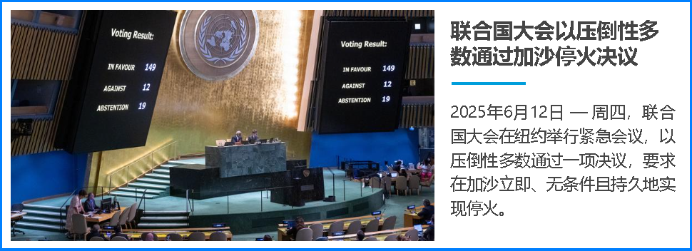 新華社聯(lián)合國6月13日電 聯(lián)合國大會(huì)緊急特別會(huì)議12日通過決議,要求以巴沖突方立即無條件永久?;稹?/span>中國常駐聯(lián)合國代表傅聰在表決后作解釋性發(fā)言,認(rèn)為新決議發(fā)出了強(qiáng)有力的政治信號。