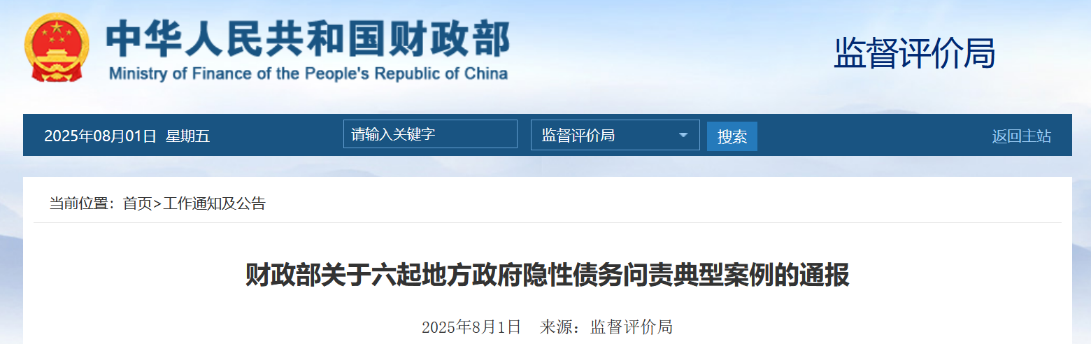8月1日,財(cái)政部監(jiān)督評(píng)價(jià)局就六起地方政府隱性債務(wù)問(wèn)責(zé)典型案例發(fā)布通報(bào):