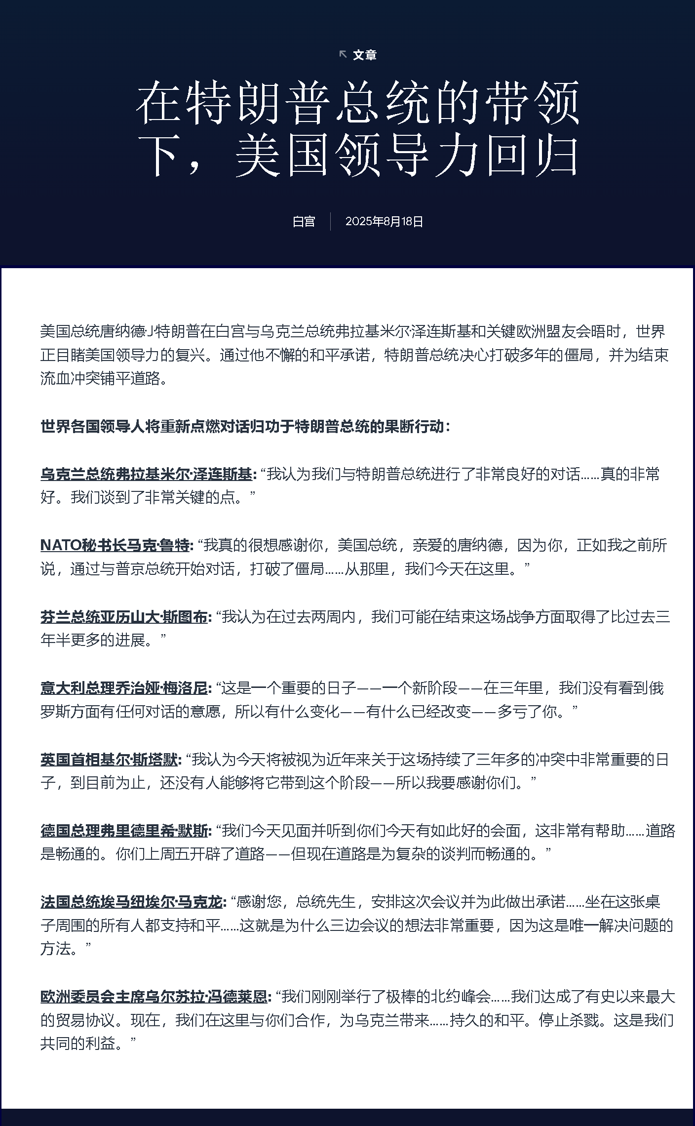 芬蘭總統(tǒng)亞歷山大·斯圖布: “我認(rèn)為在過去兩周內(nèi),我們可能在結(jié)束這場戰(zhàn)爭方面取得了比過去三年半更多的進(jìn)展?!?