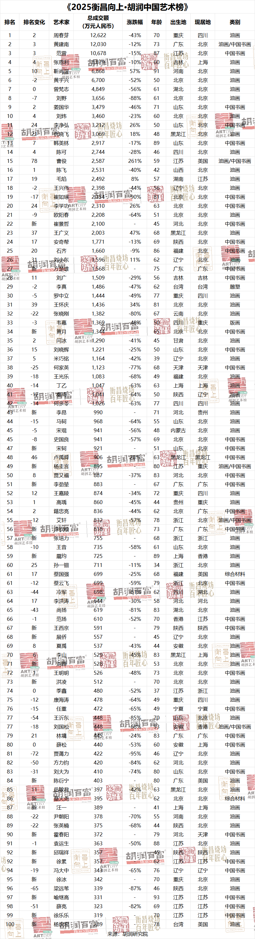 《2025胡潤最暢銷中國藝術(shù)家》(包括在世和已故藝術(shù)家)前十名