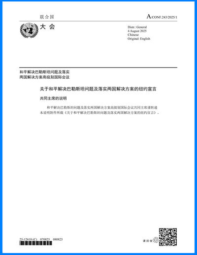 《紐約宣言》是今年7月在聯(lián)合國總部召開的有關(guān)巴勒斯坦問題國際會(huì)議產(chǎn)生的一個(gè)成果,該會(huì)議由法國和沙特阿拉伯共同主辦,并將于本月下旬繼續(xù)舉行。