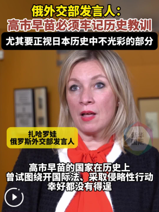 俄羅斯外交部發(fā)言人扎哈羅娃18日在莫斯科接受新華社記者專訪時表示,日本首相高市早苗日前的涉臺言論非常危險,日本應深刻反省歷史、汲取二戰(zhàn)教訓。