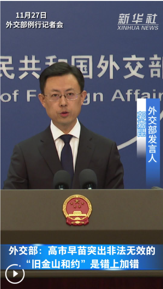 高市早苗首相對具有充分國際法效力且在《中日聯(lián)合聲明》和《中日和平友好條約》等雙邊文件中明確強調(diào)的《開羅宣言》《波茨坦公告》避而不談,卻唯一突出非法無效的“舊金山和約”,這再次表明,她時至今日仍不思悔改,仍在持續(xù)損害中日四個政治文件精神確定的中日關(guān)系政治基礎(chǔ),無視聯(lián)合國權(quán)威,公然挑戰(zhàn)戰(zhàn)后國際秩序和國際法基本準則,甚至妄圖煽炒所謂“臺灣地位未定論”。這是錯上加錯,中方對此堅決反對,國際社會也應(yīng)高度警惕。我們再次敦促日方切實反思糾錯,撤回錯誤言論,以實際行動體現(xiàn)對華承諾,以實際行動履行作為聯(lián)合國會員國起碼應(yīng)盡的義務(wù)。