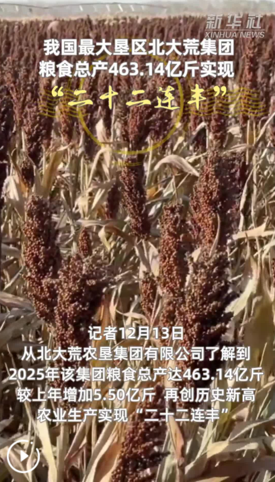 新華社哈爾濱12月14日電(記者黃騰)記者12月13日從北大荒農(nóng)墾集團(tuán)有限公司了解到,2025年該集團(tuán)糧食總產(chǎn)達(dá)463.14億斤,較上年增加5.50億斤,再創(chuàng)歷史新高,農(nóng)業(yè)生產(chǎn)實(shí)現(xiàn)“二十二連豐”。