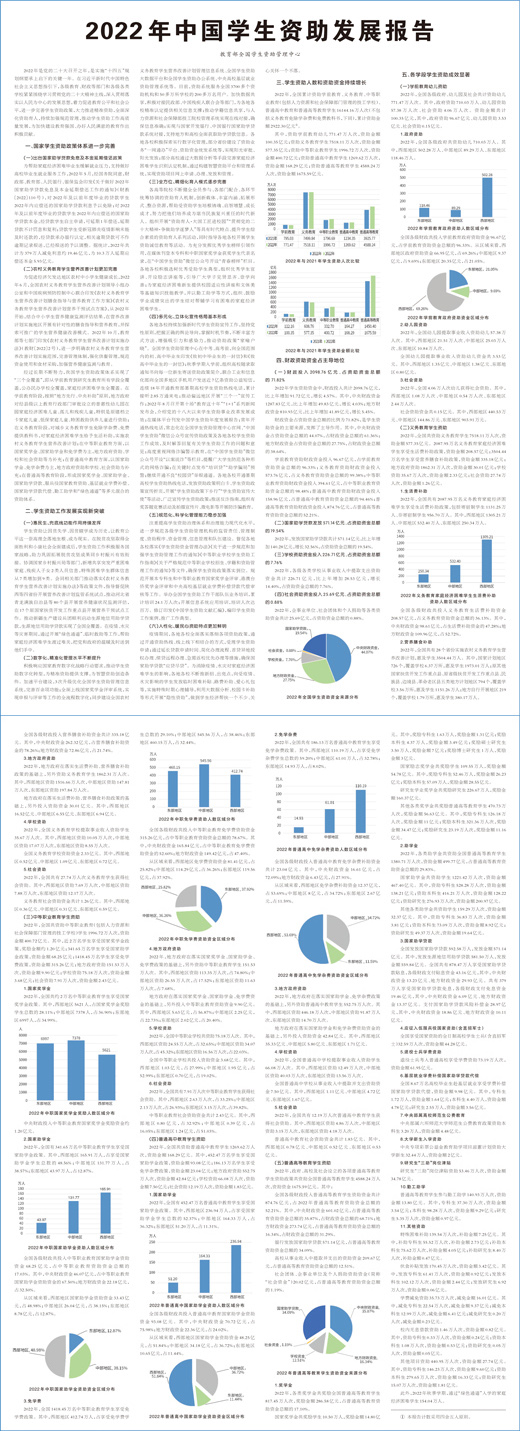 2022年是黨的二十大召開之年,是實施“十四五”規(guī)劃綱要承上啟下的關鍵一年。在習近平新時代中國特色社會主義思想指引下,各級教育、財政等部門和各級各類學校緊緊圍繞學習貫徹黨的二十大精神主線,深入貫徹落實以人民為中心的發(fā)展思想,著力促進教育公平和社會公平,進一步完善學生資助政策,大力推進精準資助,全面深化資助育人,持續(xù)加強規(guī)范管理,推動學生資助工作高質(zhì)量發(fā)展,為加快建設教育強國、辦好人民滿意的教育作出積極貢獻。