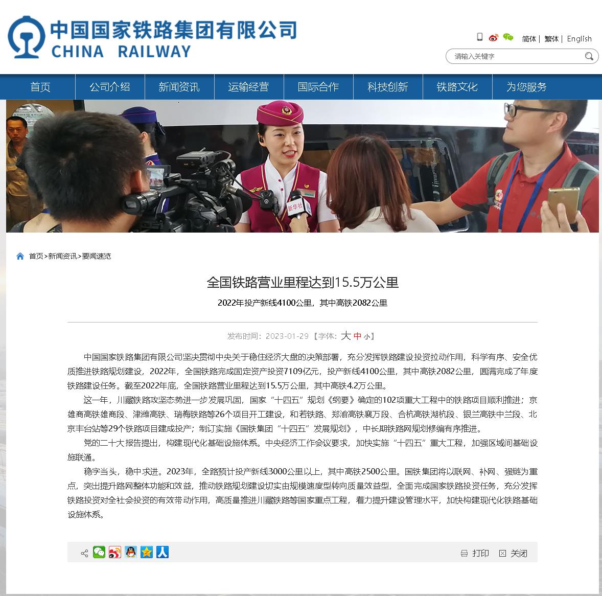 中新網(wǎng)1月29日電 據(jù)中國(guó)國(guó)家鐵路集團(tuán)有限公司網(wǎng)站消息,2022年,全國(guó)鐵路完成固定資產(chǎn)投資7109億元,投產(chǎn)新線4100公里,其中高鐵2082公里,圓滿完成了年度鐵路建設(shè)任務(wù)。截至2022年底,全國(guó)鐵路營(yíng)業(yè)里程達(dá)到15.5萬(wàn)公里,其中高鐵4.2萬(wàn)公里。