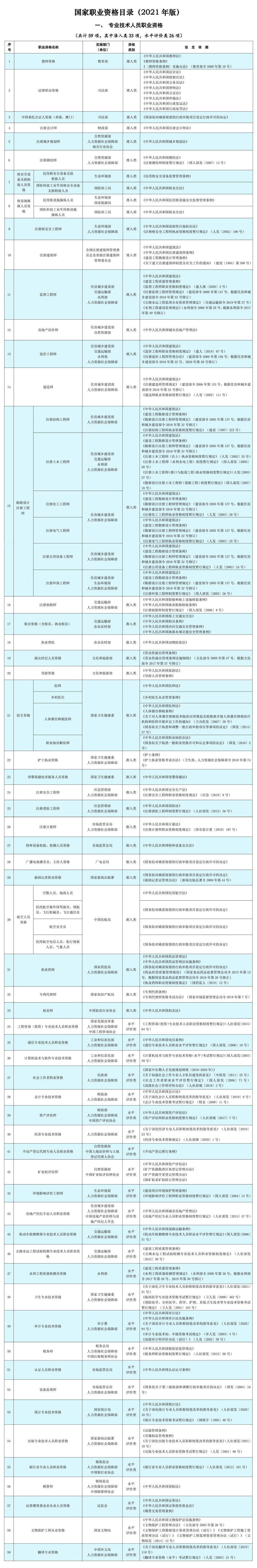 根據(jù)國務院推進簡政放權、放管結合、優(yōu)化服務改革要求,人力資源社會保障部會同國務院有關部門對《國家職業(yè)資格目錄》進行優(yōu)化調(diào)整,形成了《國家職業(yè)資格目錄(2021年版)》,經(jīng)國務院同意,現(xiàn)予以公布。