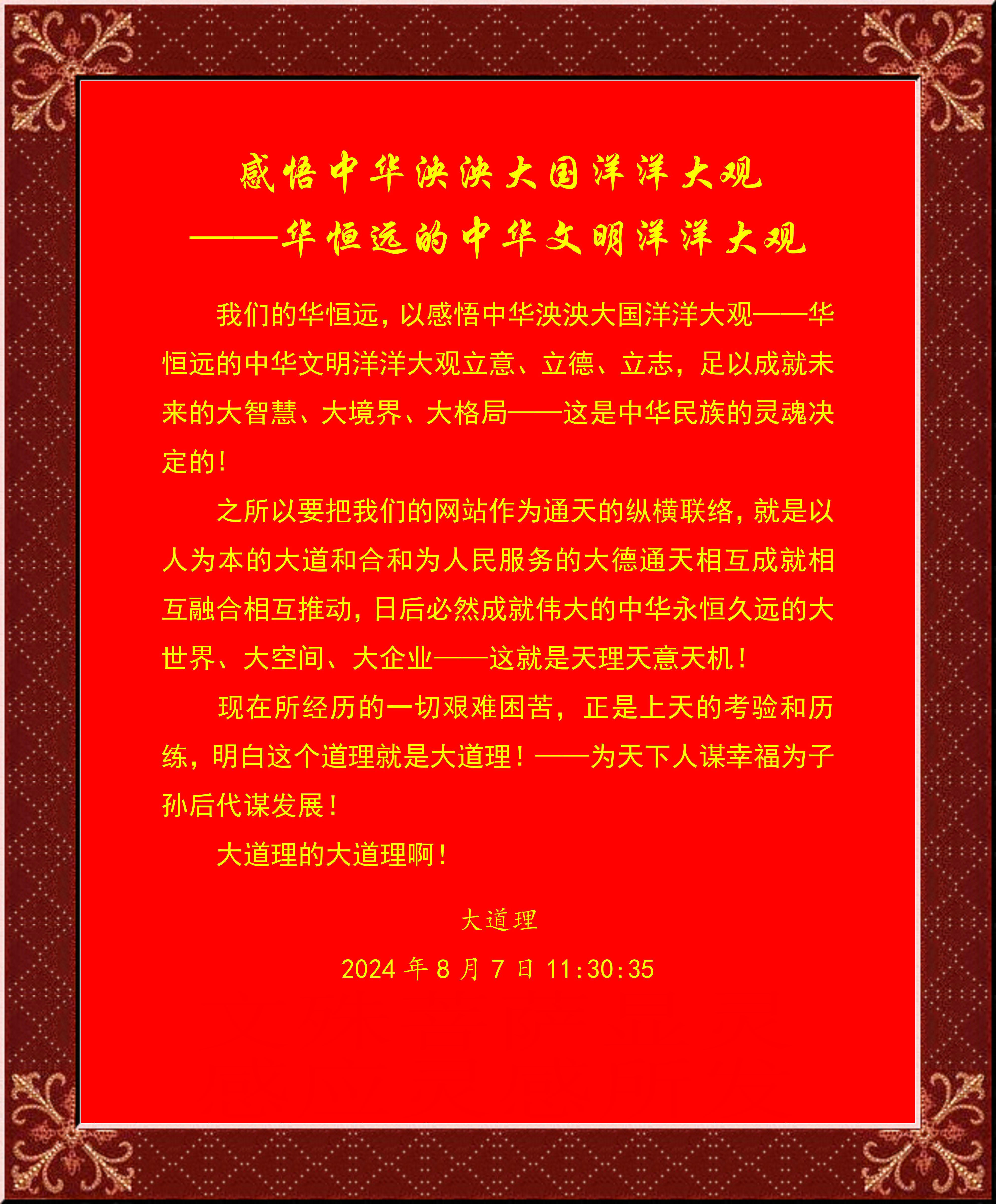 我們的華恒遠(yuǎn),以感悟中華泱泱大國洋洋大觀——華恒遠(yuǎn)的中華文明洋洋大觀立意、立德、立志,足以成就未來的大智慧、大境界、大格局——這是中華民族的靈魂決定的!