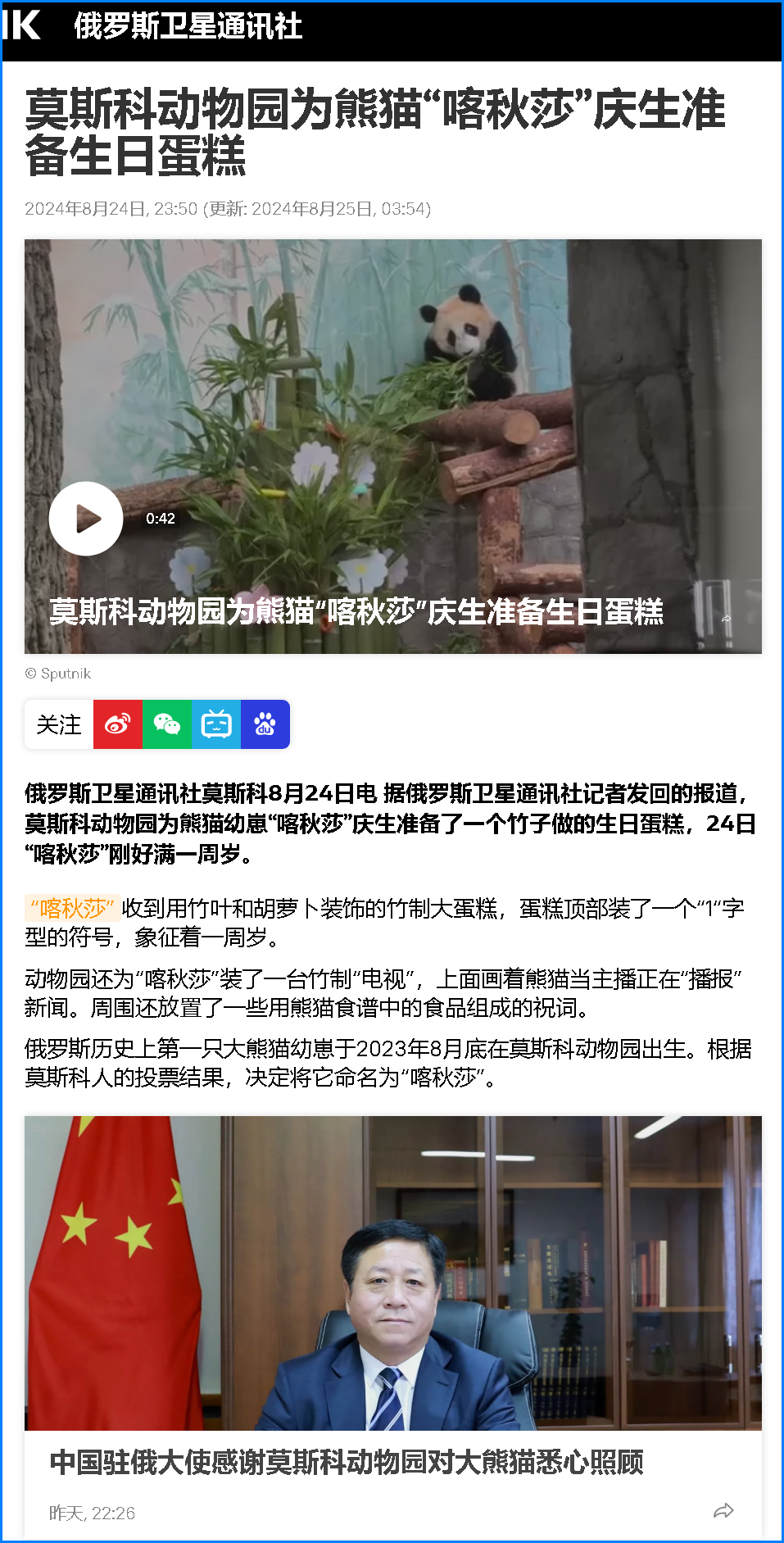 2023年8月24日,旅俄大熊貓“丁丁”首誕幼崽。這是在俄羅斯出生的首只大熊貓幼崽?!翱η锷钡母改浮叭缫狻焙汀岸《 庇?019年4月抵達(dá)莫斯科,深受俄羅斯民眾的喜愛。