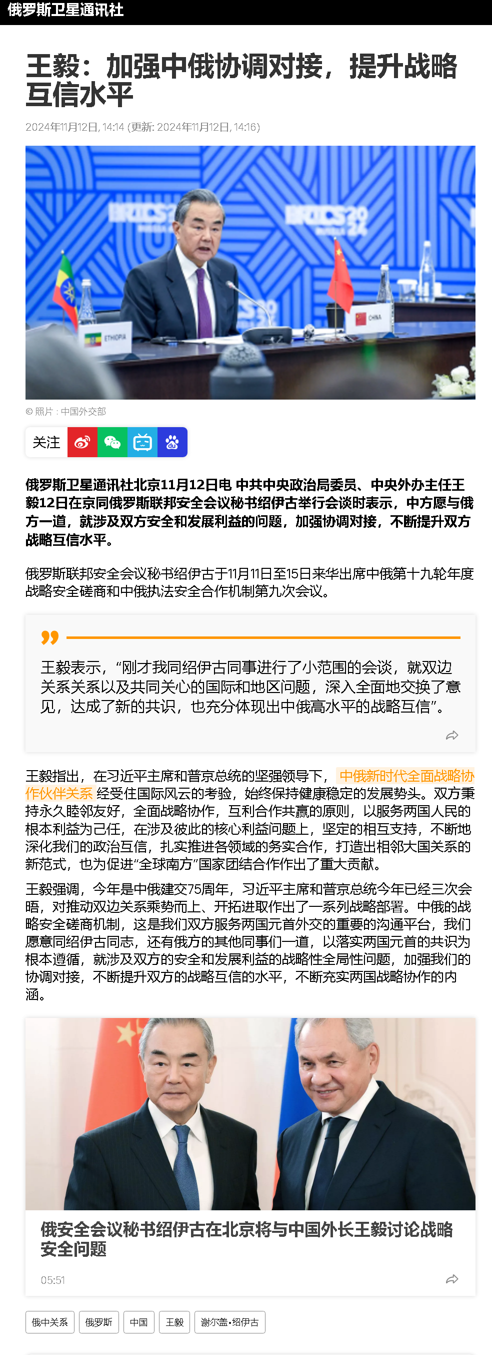 而普京在公開祝賀特朗普當(dāng)選美國總統(tǒng)時(shí),也曾表示特朗普希望恢復(fù)美俄關(guān)系,并幫助結(jié)束俄烏沖突的表態(tài)“是值得關(guān)注的”。可見,普京政府還是非常期待特朗普上臺后能夠?yàn)榻鉀Q俄烏沖突注入積極因素,準(zhǔn)備認(rèn)真聽取美方的建議。這自然也將為俄烏局勢帶來新的走向。紹伊古此次來中國,不排除就是想與中國討論一下此事,想聽聽中國的意見。那中方會是什么態(tài)度呢?事實(shí)上,前幾天中方被問及普京的上述表態(tài)時(shí),我外交部發(fā)言人毛寧就已經(jīng)說了,美俄關(guān)系如何發(fā)展是美國和俄羅斯兩個(gè)主權(quán)國家的事。至于烏克蘭危機(jī),中方的立場是一貫的,我們支持一切有利于政治解決沖突的努力。