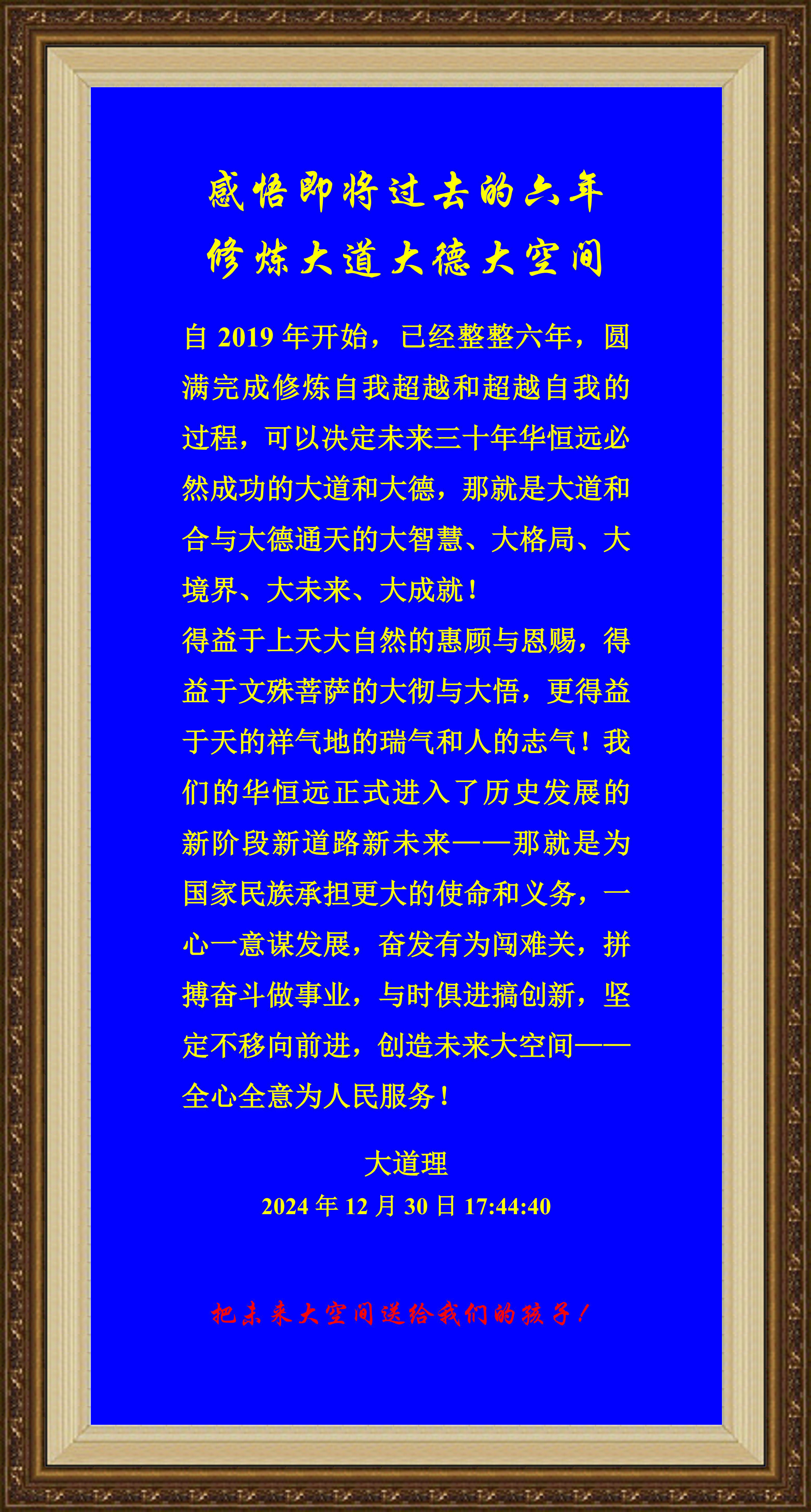 自2019年開始,已經(jīng)整整六年,圓滿完成修煉自我超越和超越自我的過程,可以決定未來三十年華恒遠必然成功的大道和大德,那就是大道和合與大德通天的大智慧、大格局、大境界、大未來、大成就!