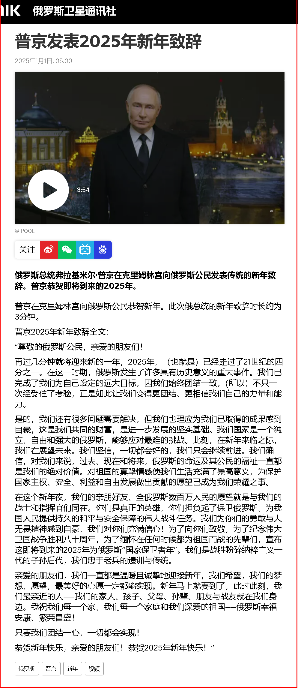 普京2025年新年致辭全文: