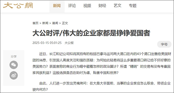 3月15日,香港《大公報(bào)》發(fā)布題為“偉大的企業(yè)家都是錚錚愛國者”的時(shí)評(píng),就李嘉誠旗下香港長江和記實(shí)業(yè)有限公司擬將包括巴拿馬運(yùn)河兩大港口在內(nèi)的43個(gè)港口出售給美國財(cái)團(tuán)的消息提出5個(gè)問題。