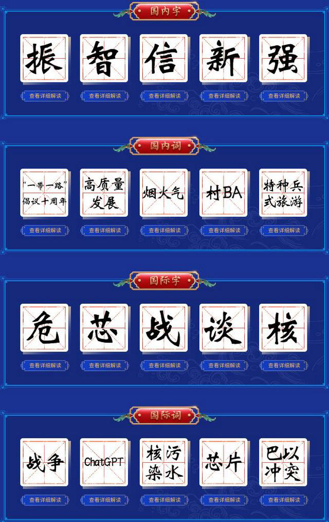 前五位年度國(guó)內(nèi)候選字為“振”“智”“信”“新”“強(qiáng)”,前五位年度國(guó)內(nèi)候選詞為“‘一帶一路’倡議十周年”“高質(zhì)量發(fā)展”“煙火氣”“村BA”“特種兵式旅游”;前五位年度國(guó)際候選字為“?!薄靶尽薄皯?zhàn)”“談”“核”,前五位年度國(guó)際候選詞為“戰(zhàn)爭(zhēng)”“ChatGPT”“核污染水”“芯片”“巴以沖突”。