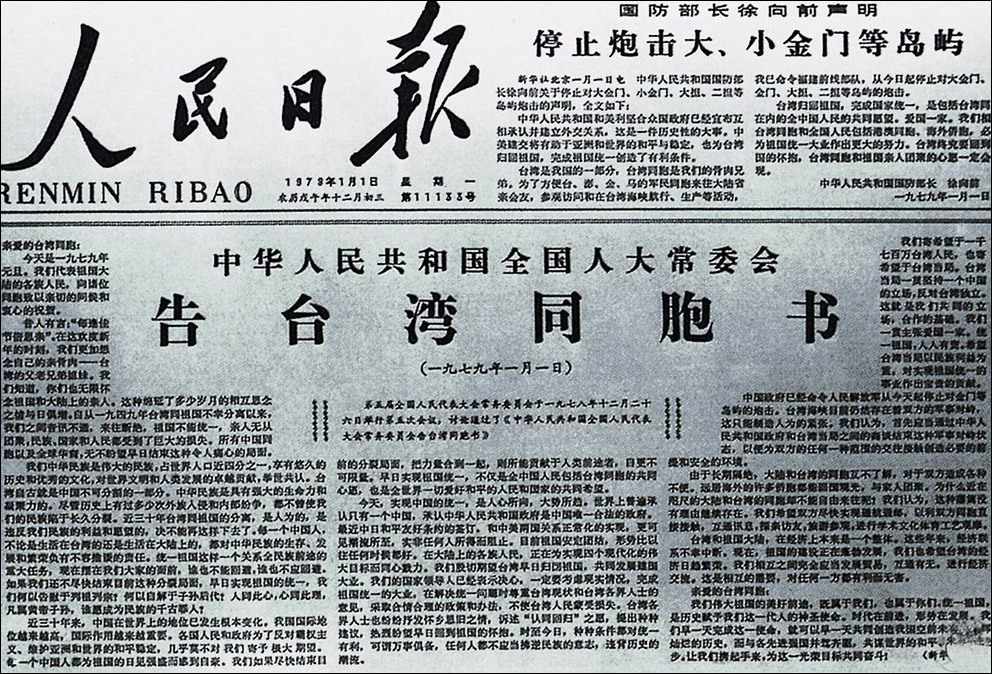 1979年元旦,中國(guó)同美國(guó)正式建立外交關(guān)系。同日,全國(guó)人大常委會(huì)發(fā)表《告臺(tái)灣同胞書(shū)》,正式提出實(shí)現(xiàn)和平統(tǒng)一的大政方針;時(shí)任國(guó)防部長(zhǎng)徐向前發(fā)表聲明,宣布停止自1958年以來(lái)解放軍對(duì)金門(mén)等島嶼的炮擊。