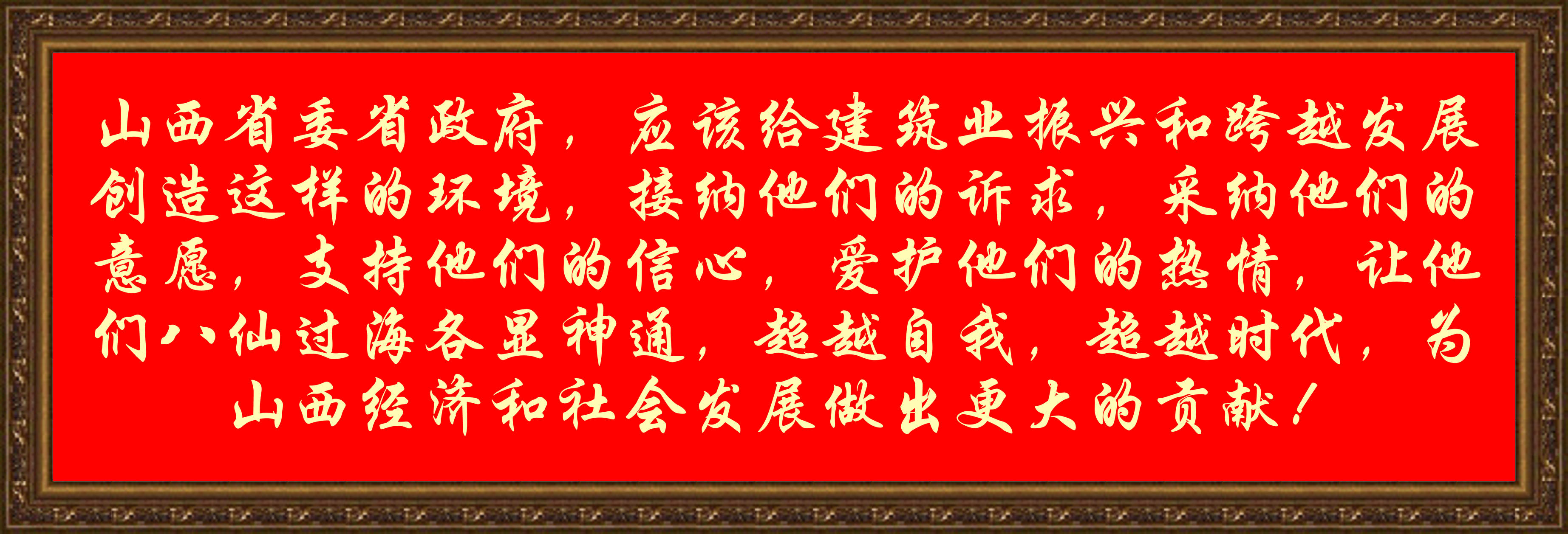 山西省委省政府,應該給建筑業(yè)振興和跨越發(fā)展創(chuàng)造這樣的環(huán)境,接納他們的訴求,采納他們的意愿,支持他們的信心,愛護他們的熱情,讓他們八仙過海各顯神通,超越自我,超越時代,為山西經(jīng)濟和社會發(fā)展做出更大的貢獻!