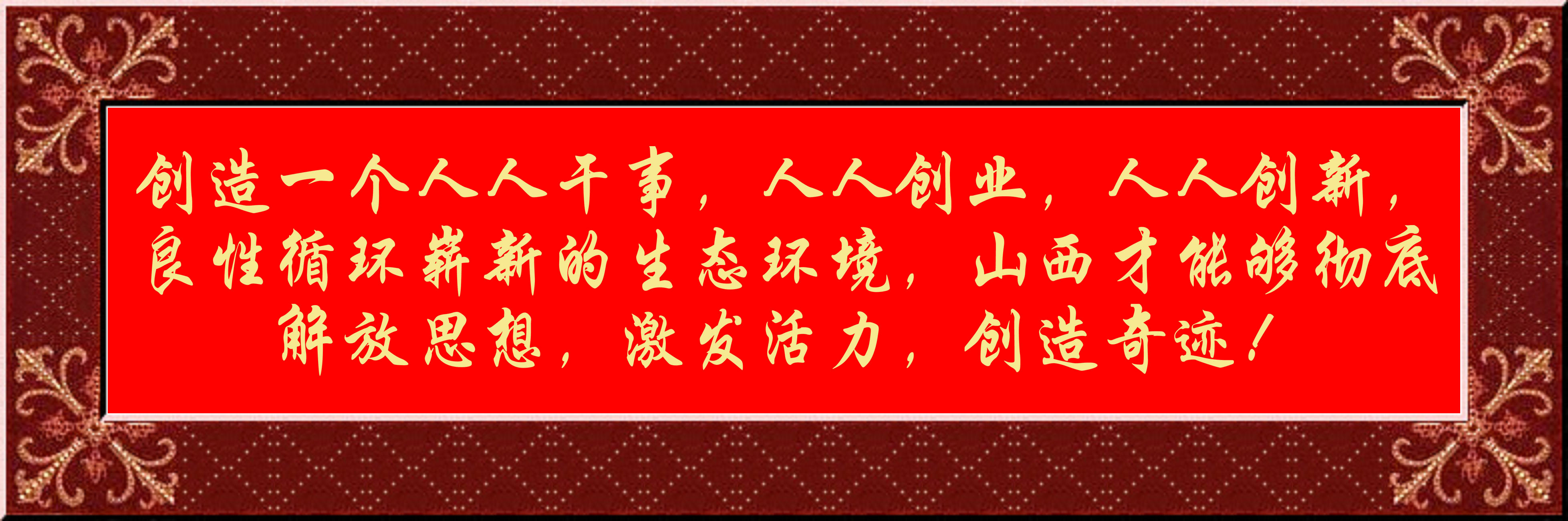山西需要發(fā)展,需要大發(fā)展,需要以更大的膽識和魄力面對自身的差距和不足,那就是敢于革自己的命,把那些不適應(yīng)新時(shí)代發(fā)展的條條框框徹底打破,把那些只為名而不為民的庸官徹底清除,創(chuàng)造一個(gè)人人干事,人人創(chuàng)業(yè),人人創(chuàng)新,良性循環(huán)嶄新的生態(tài)環(huán)境,山西才能夠徹底解放思想,激發(fā)活力,創(chuàng)造奇跡!