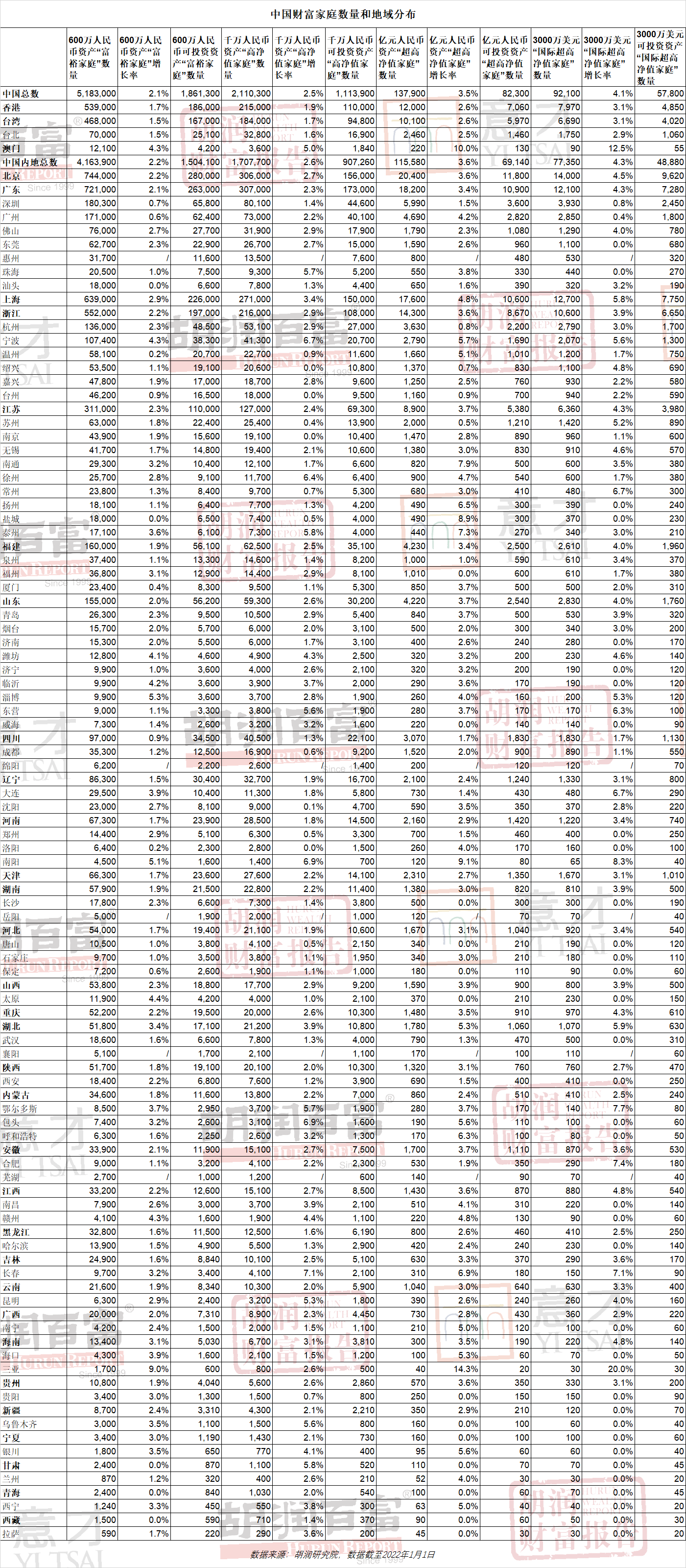 胡潤研究院今日發(fā)布《2023胡潤財富報告》(Hurun Wealth Report 2023)。報告揭示了目前中國財富家庭數(shù)量、地域分布情況以及人群畫像。這是胡潤研究院連續(xù)第15年發(fā)布《胡潤財富報告》。報告除了公布中國擁有600萬人民幣、千萬人民幣、億元人民幣和3000萬美元總財富的家庭數(shù)量之外,也公布了擁有600萬人民幣、千萬人民幣、億元人民幣和3000萬美元可投資資產(chǎn)的家庭數(shù)量。